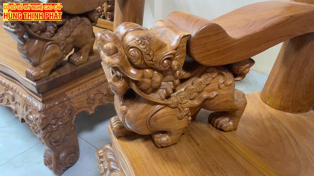 Tay ghế: Cao 34cm, dày 16mm, được đục chạm hình con Tì Hưu – linh vật mang lại may mắn và tài lộc.