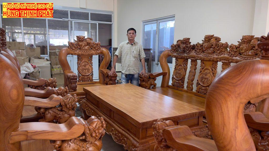 Bộ bàn ghế salông phòng khách gỗ gõ đỏ này được chế tác từ gỗ gõ đỏ nhập khẩu chất lượng cao, được Đồ Gỗ Hùng Thịnh Phát chắt lọc kỹ lưỡng. Quy trình sản xuất được thực hiện nghiêm ngặt với công đoạn tẩm sấy hiện đại, đảm bảo sản phẩm không lo nứt nẻ, cong vênh trong quá trình sử dụng.