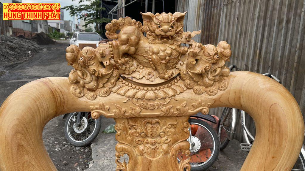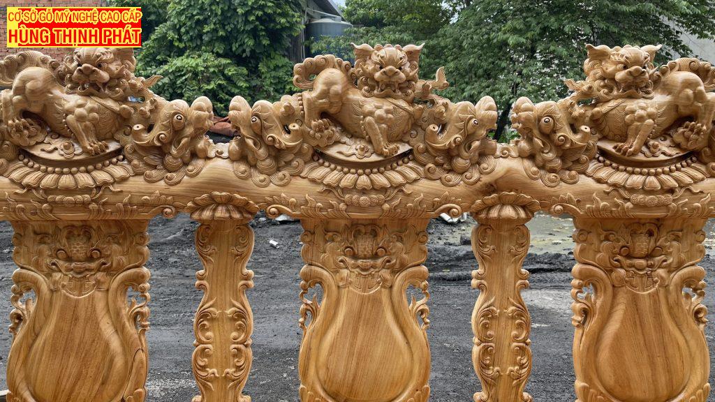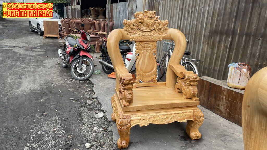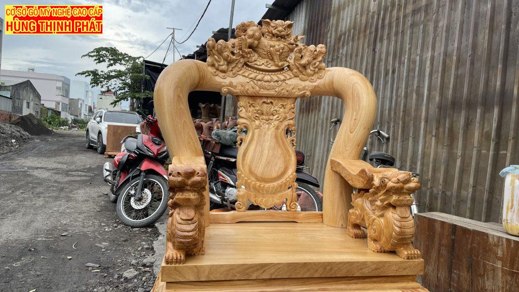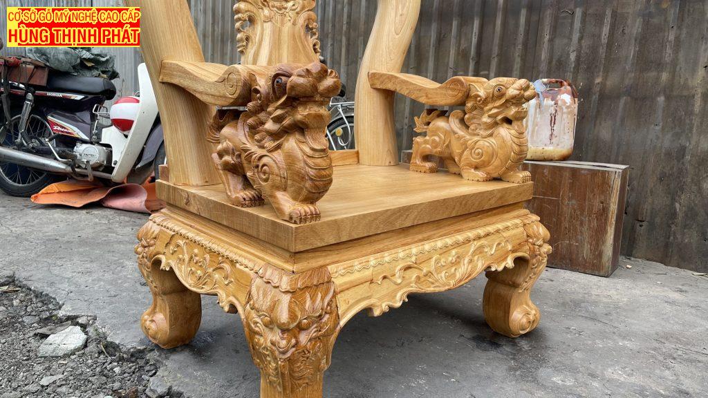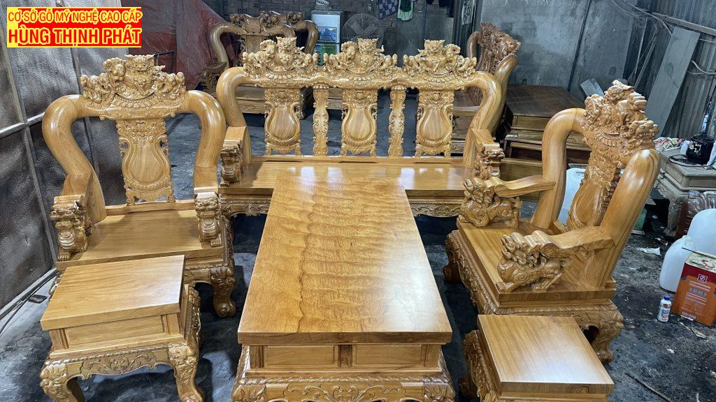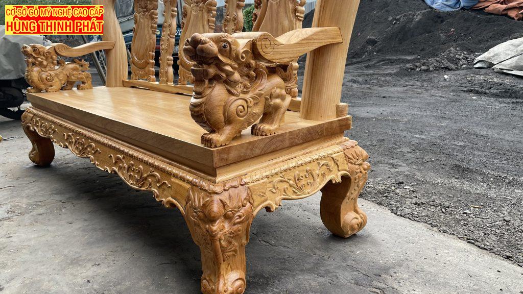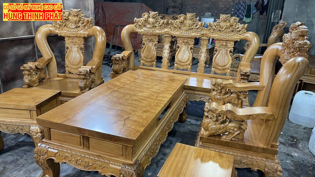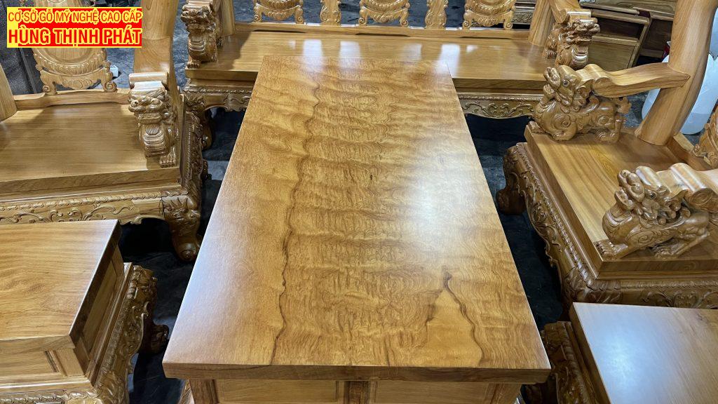 bộ bàn ghế phòng khách gỗ Gõ Đỏ tay tay 14 đục chạm Nghê. Mặt bàn dày nguyên khối là một trong những sản phẩm mà Hùng Thịnh Phát chế tác theo yêu cầu riêng từ khách hàng tại TPHCM. Bộ bàn ghế gồm 6 món phù hợp với các phòng khách vừa hoặc nhỏ và có thể bố trí thêm nhiều sản phẩm khác như tượng, lục bình…