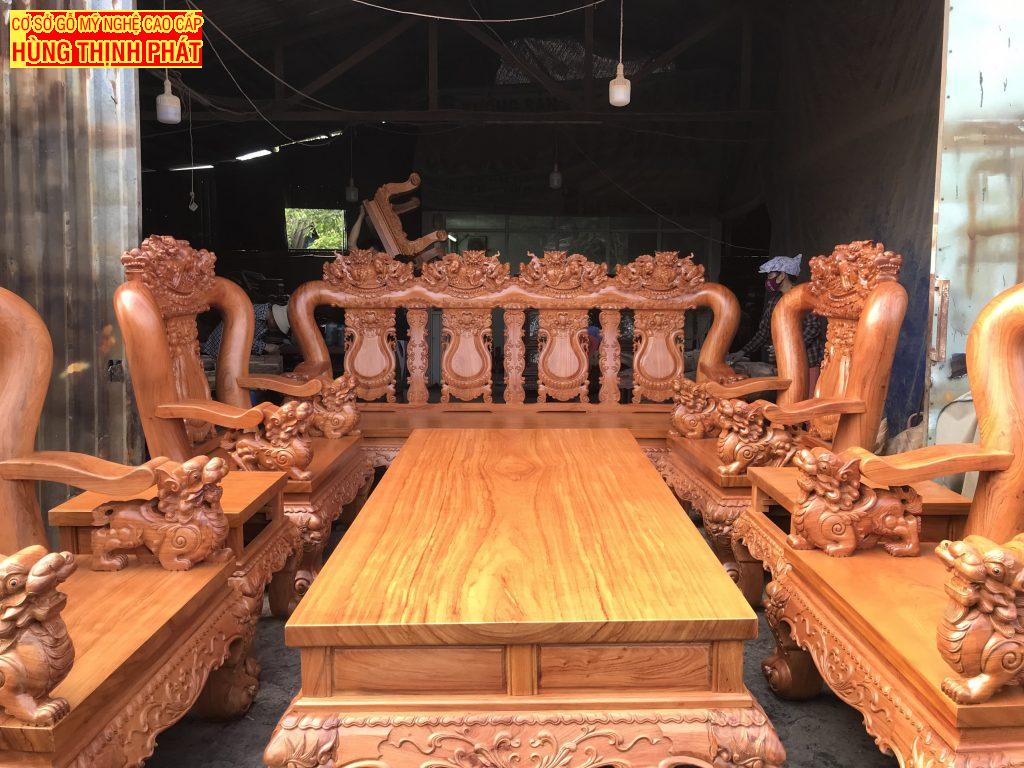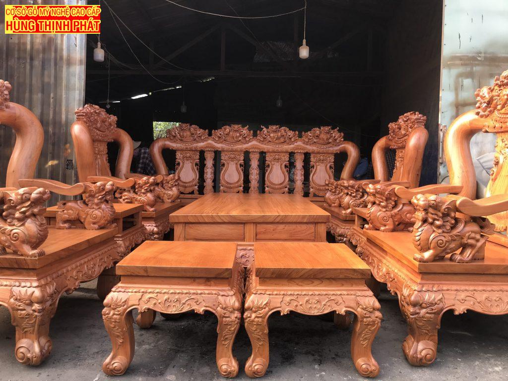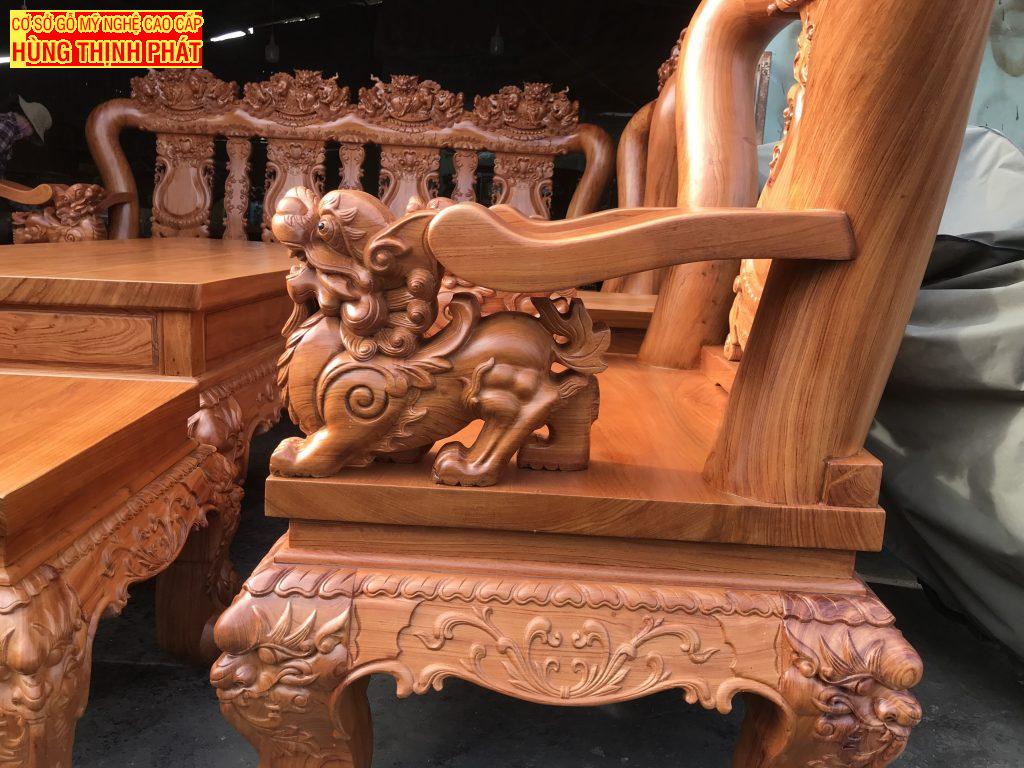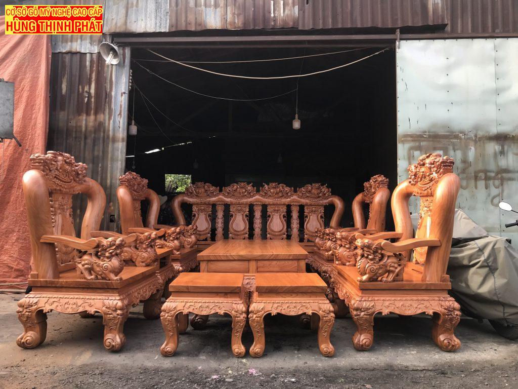 Bộ bàn ghế phòng khách gỗ gõ đỏ tay 18 đục Nghê. Bộ bà ghế với tổng là 10 món, quý khách có thể yêu cầu số món tuỳ vào diện tích, tài chính của mình. Bộ bàn ghế triển khai hoàn thiện trong vòng 2 tháng làm việc.