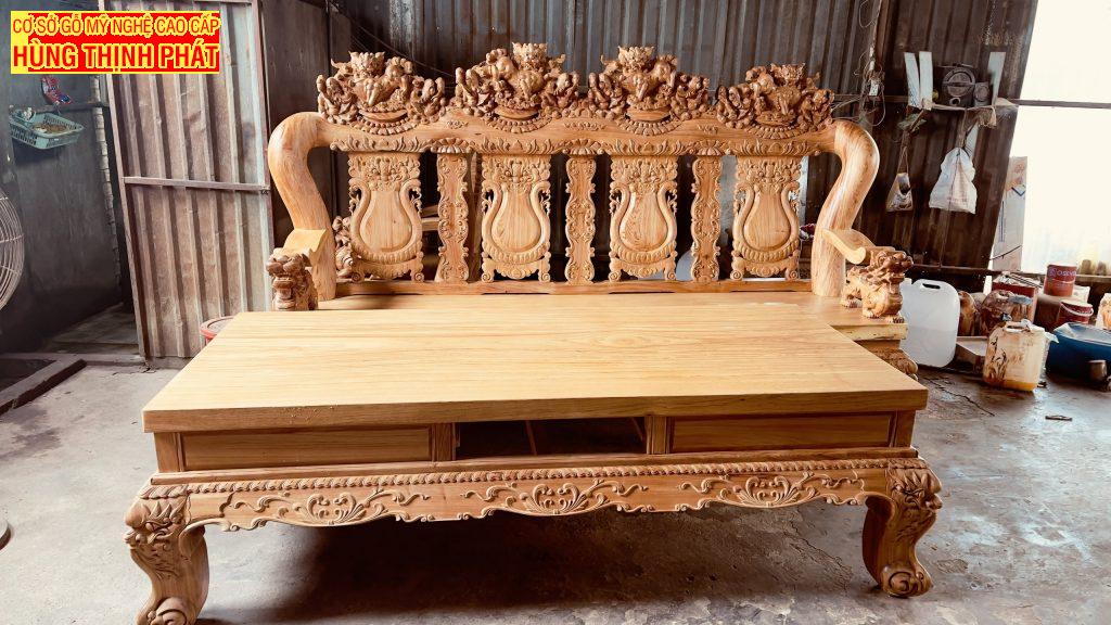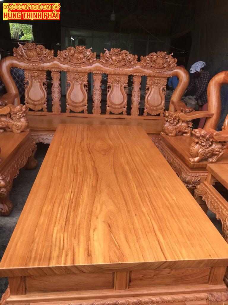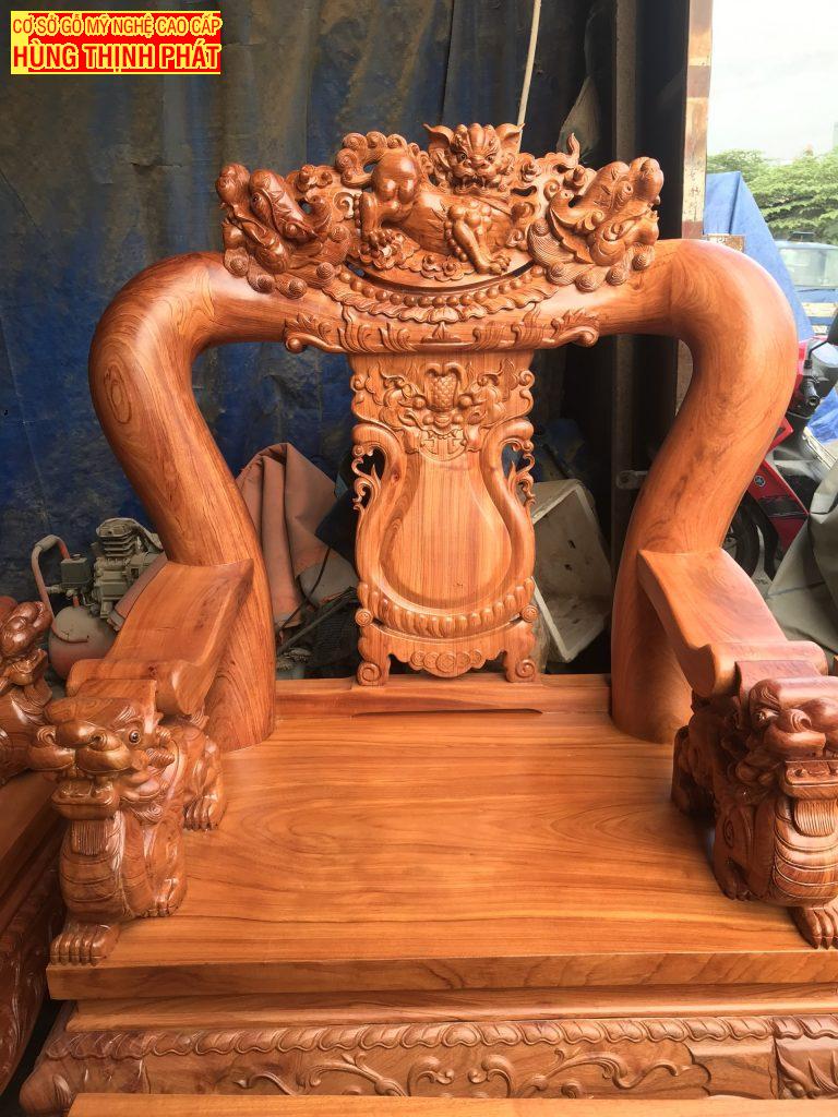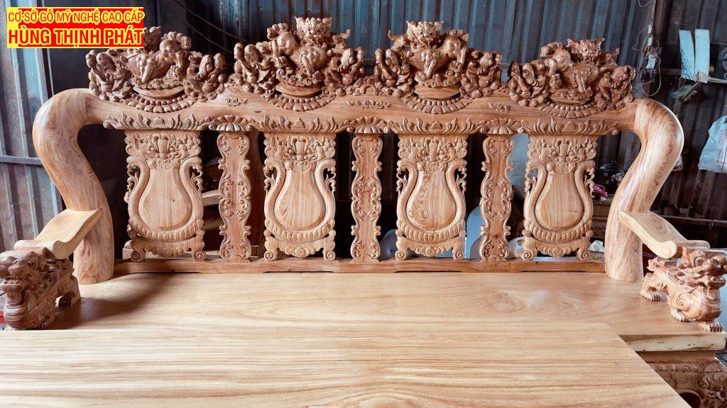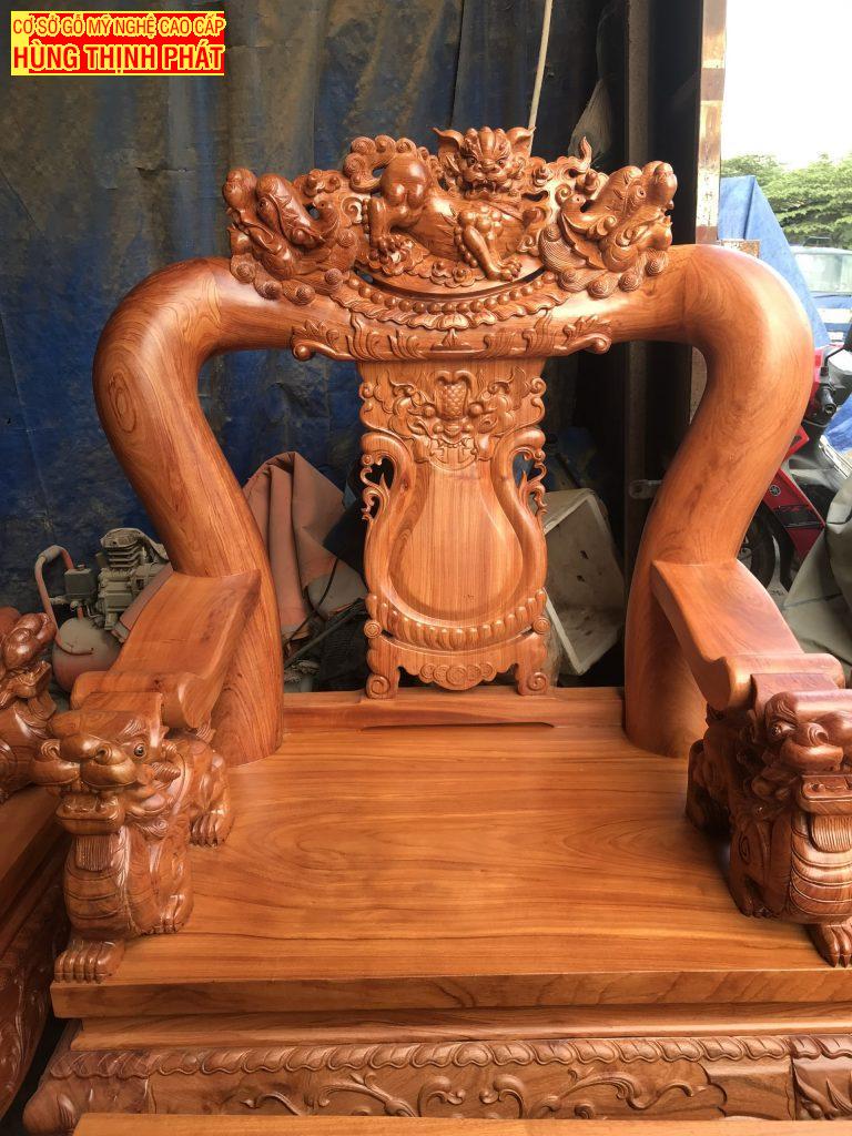 Bộ bàn ghế phòng khách gỗ gõ đỏ tay 18 đục Nghê. Bộ bà ghế với tổng là 10 món, quý khách có thể yêu cầu số món tuỳ vào diện tích, tài chính của mình. Bộ bàn ghế triển khai hoàn thiện trong vòng 2 tháng làm việc.