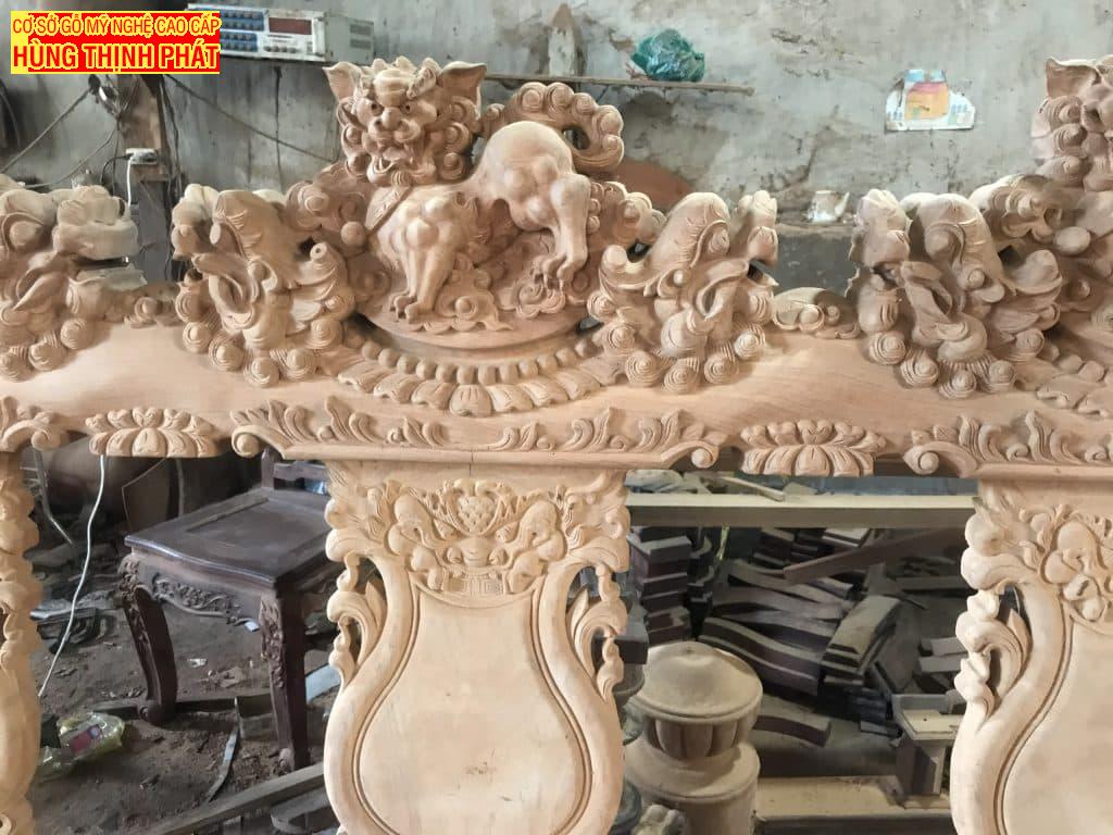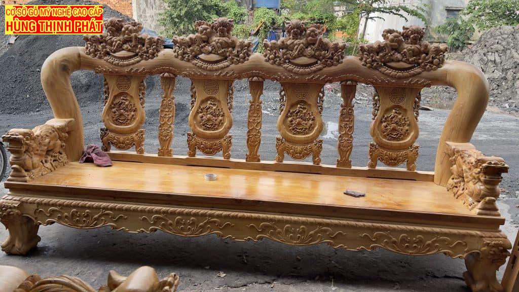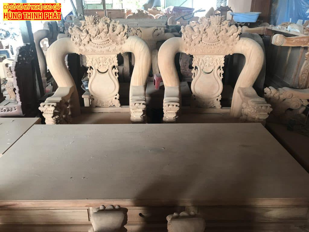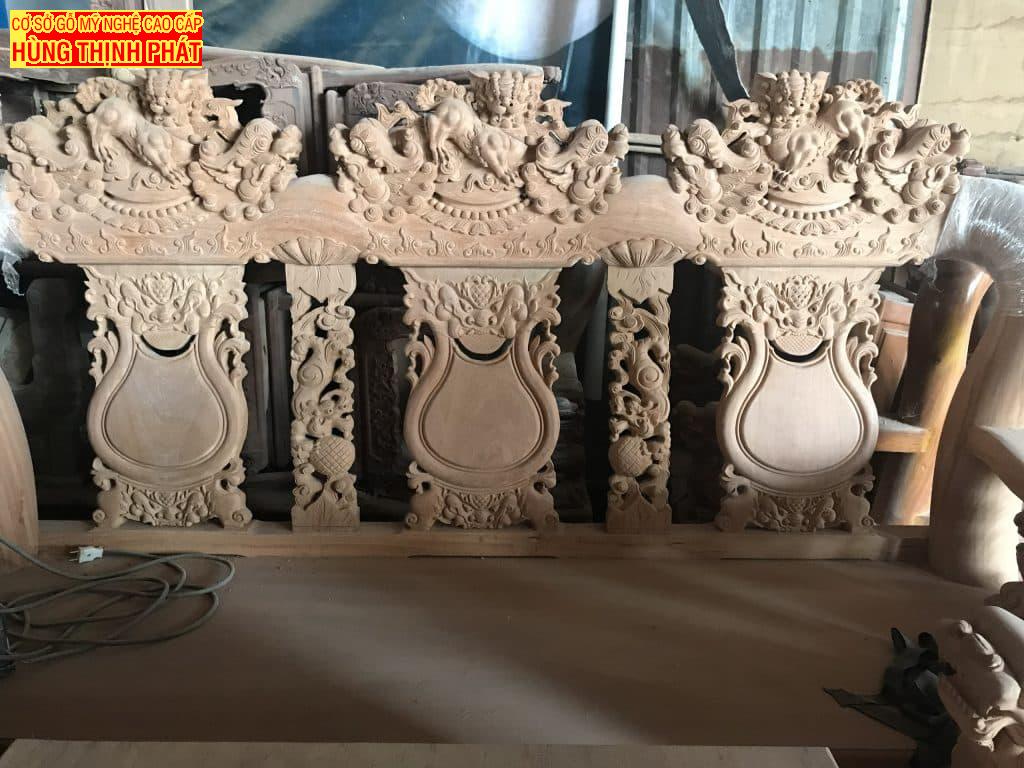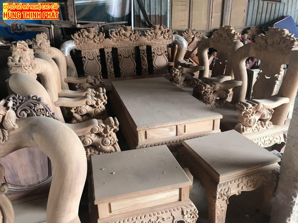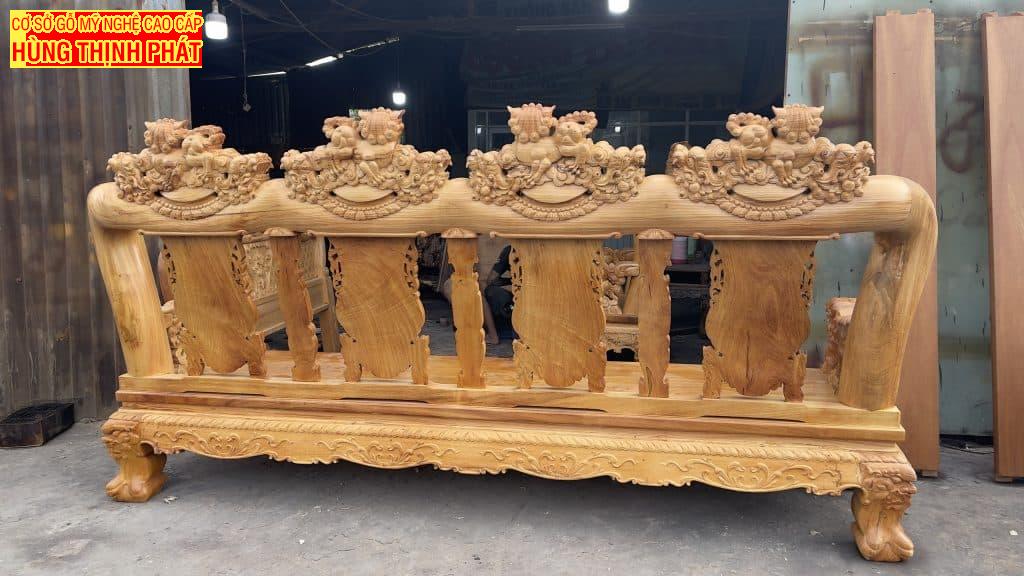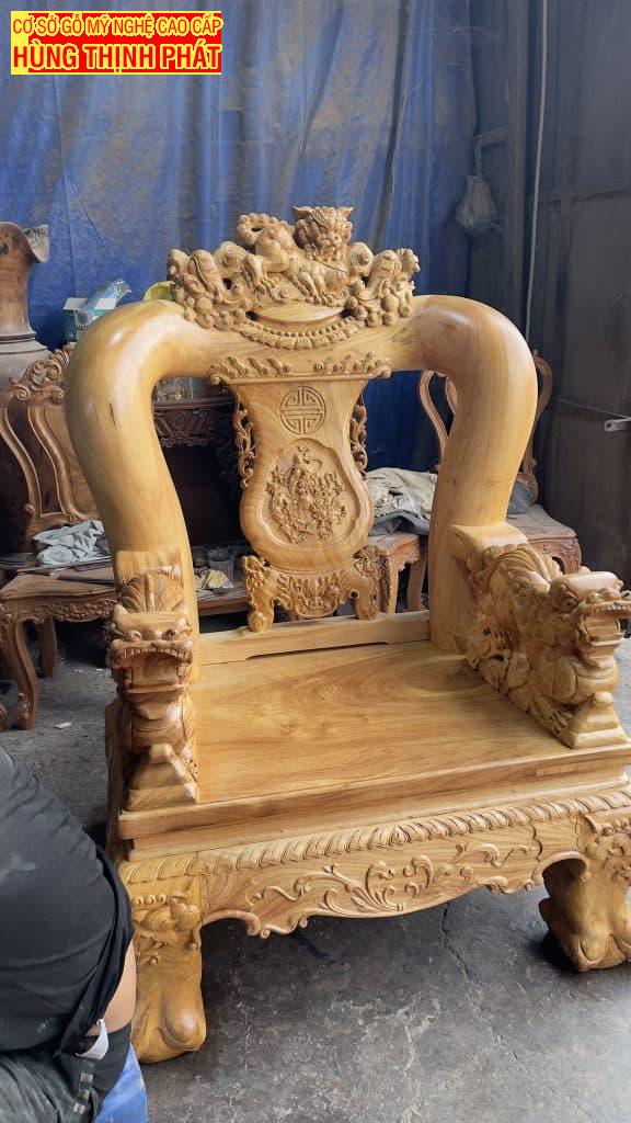 Bộ bàn ghế phòng khách gỗ Gõ Đỏ tay cột 18 đục chạm Nghê. Sản phẩm là một trong những sản phẩm gỗ Cẩm Lai kích thước lớn phù hợp với phòng khách từ 25m2 trở lên. Bộ sản phẩm được chế tác và hoàn thiện trong vòng 2 tháng làm việc liên tục.