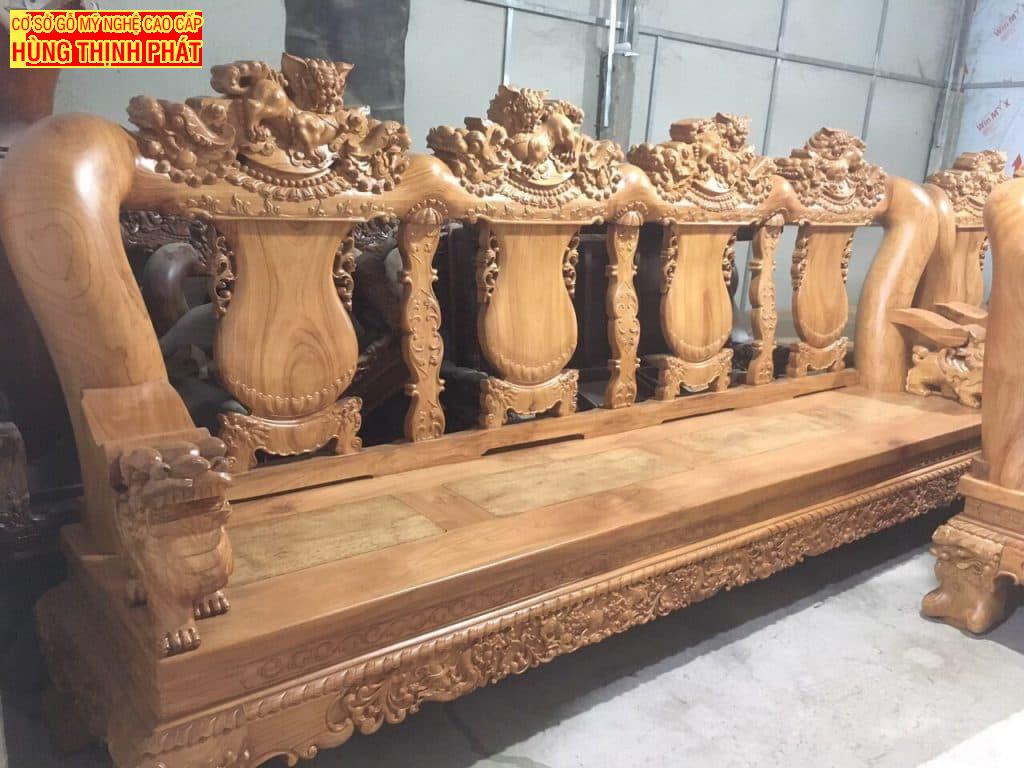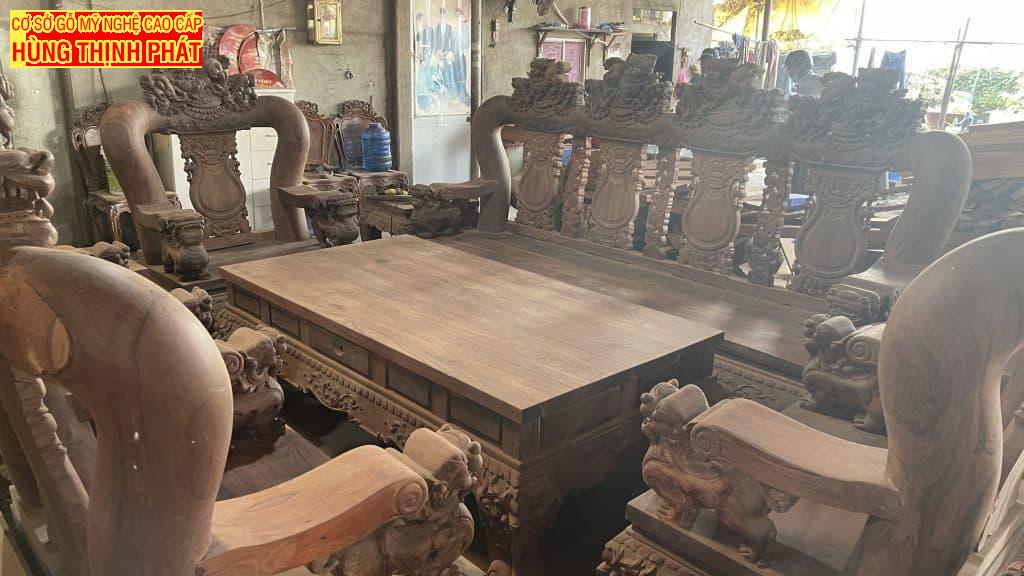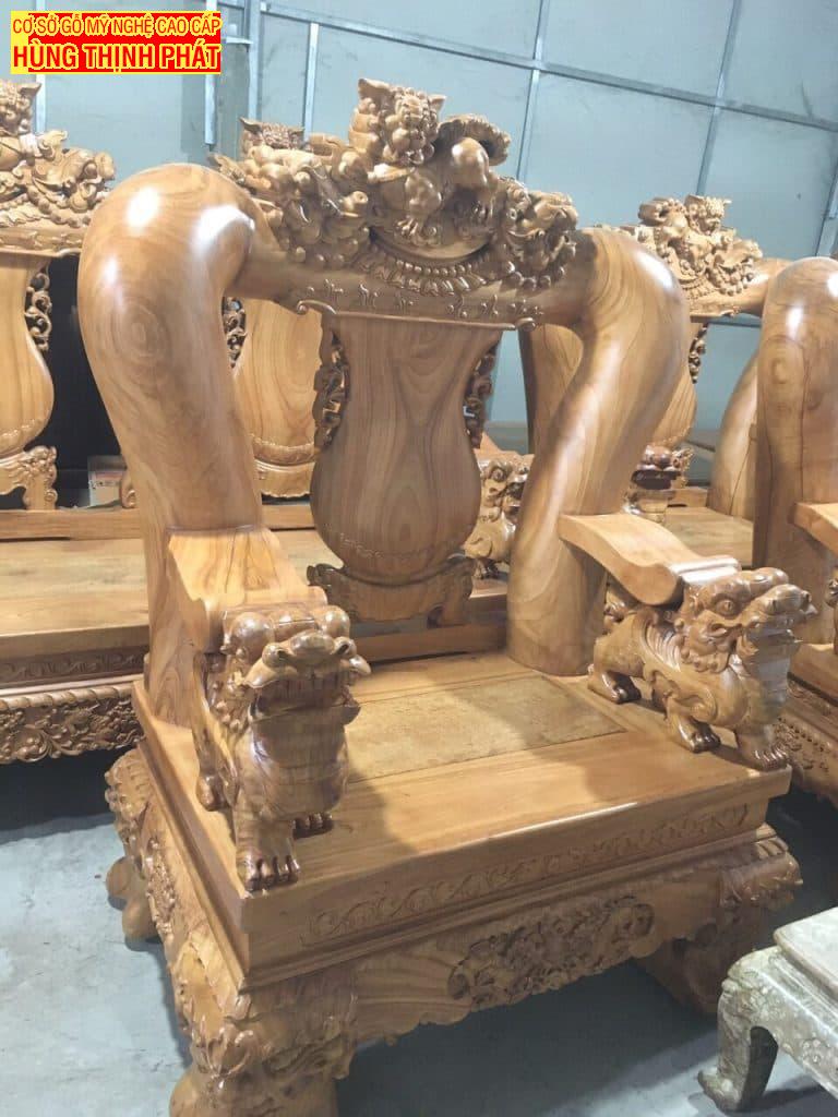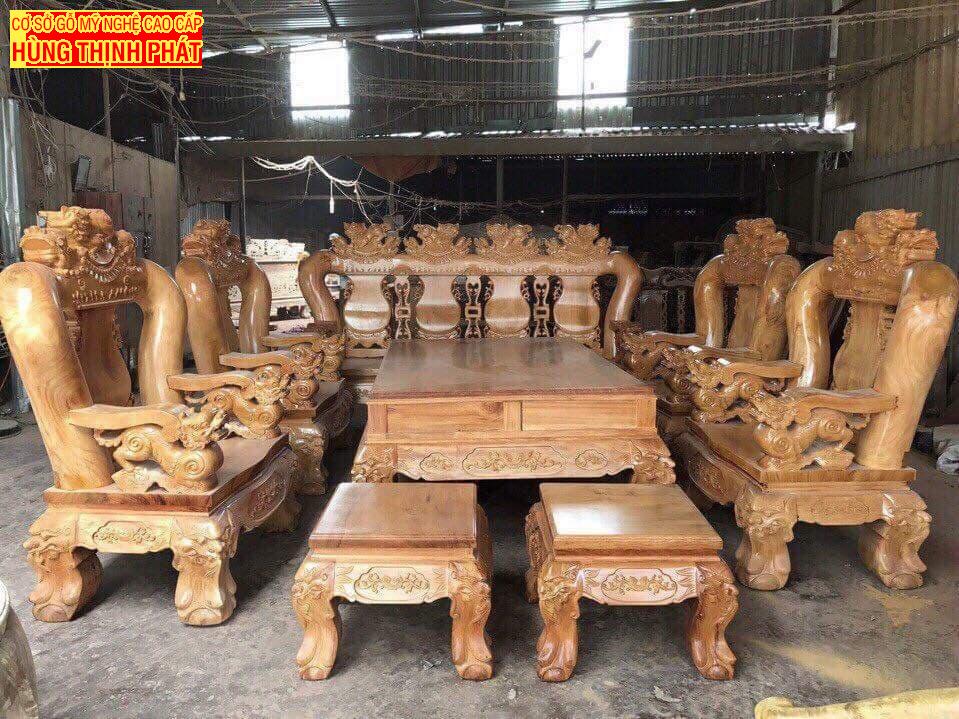Bộ bàn ghế phòng khách gỗ Gõ Đỏ Tay 20, 10 Món đục Nghê đỉnh. Bộ bàn ghế cao cấp được khách hàng yêu cầu chế tác với kích thước tay khủng. Sản phẩm cao cấp chế tác thủ công các họa tiết chạm trổ. Nghê Đỉnh cực kì oai phong và đục từ gỗ nguyên khối.