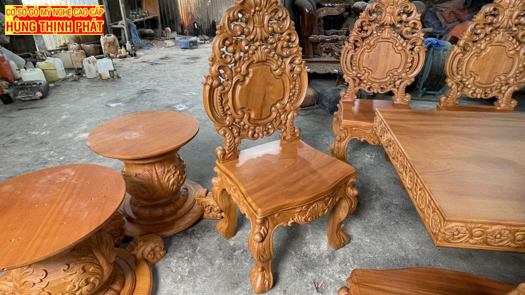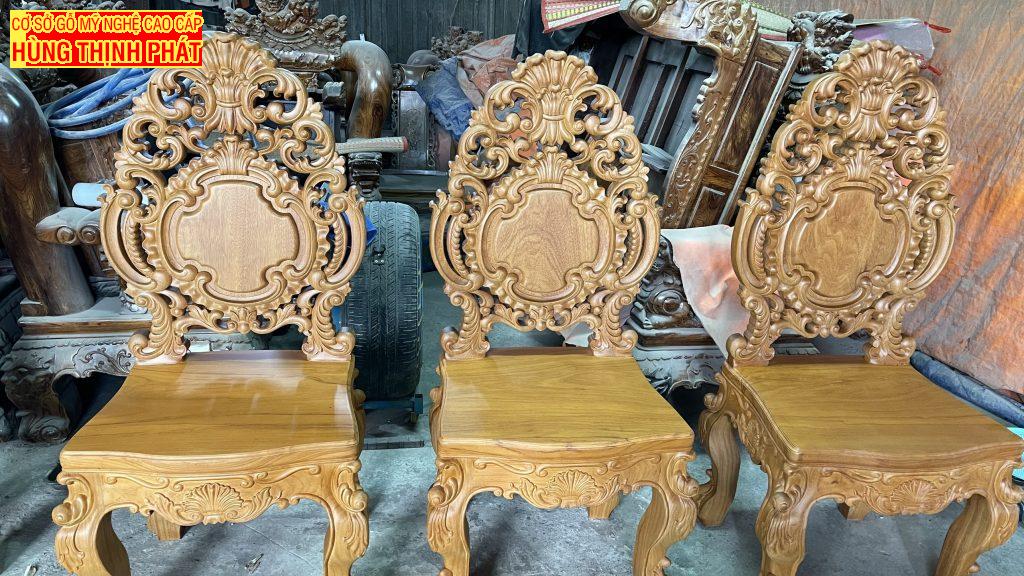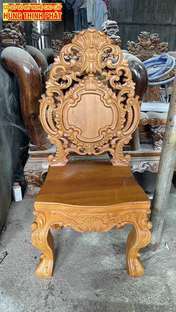 Ghế cao 1,17m, rộng 52cm, sâu 47cm kiểu dáng Louis Sơn màu gỗ tự nhiên bóng mờ 100 đục chạm hoa lá Tây .
