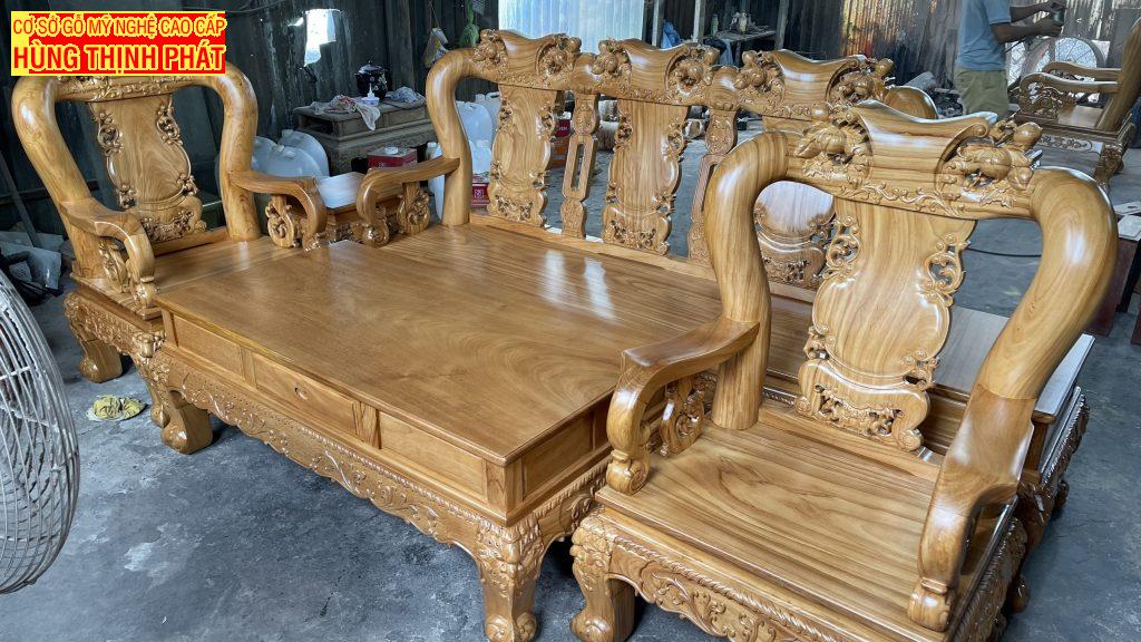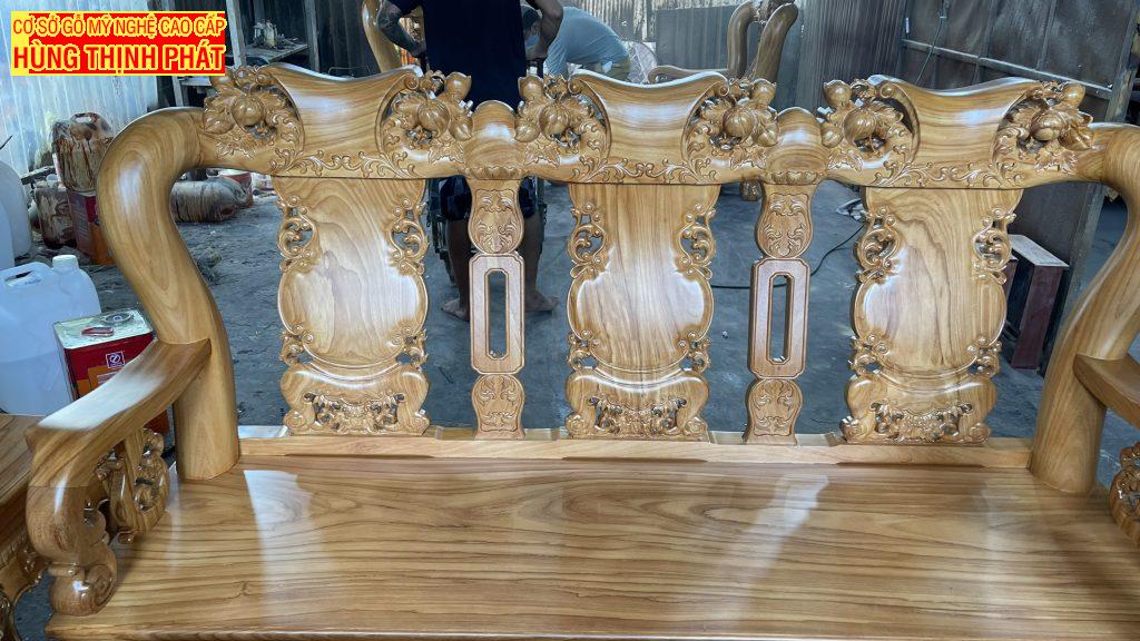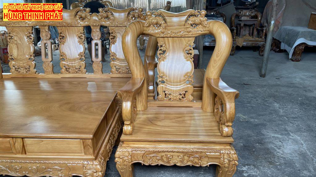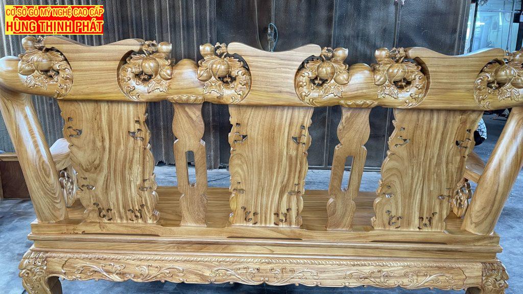 đây là bộ bàn ghế phòng khách được thiết kế mẫu mới, vách tựa lưng kiểu lục bình đục chạm thủ công hai mặt làm rất chắc chắn và giá cả hợp lý. Sơn màu gỗ tự nhiên bóng mờ rất đẹp